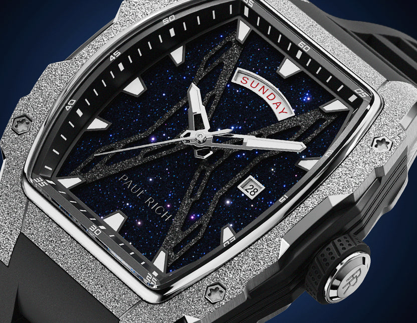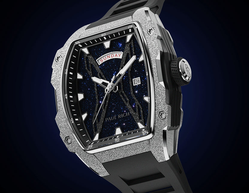 Sleek, frosted, and built for more. The Astro Day & Date tracks both the day of the week and the date, wrapped in a bold tonneau-shaped case. Modern design meets practicality.