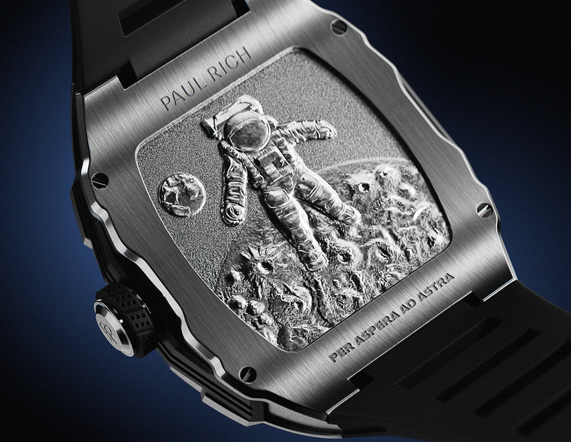 5 ATM water resistance, an anti-static silicone band, and a deployant clasp make this watch ready for anything. Style, function, and the universe—all on your wrist.
