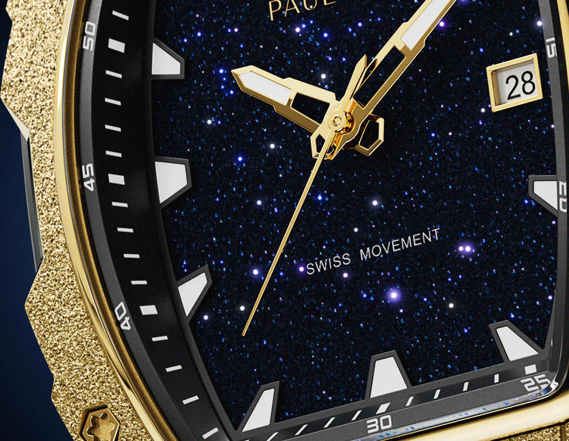 A frosted, tonneau-shaped icon that merges bold style with high-end innovation. The aventurine stone dial captures the cosmic feel, while luminous hands and markers guarantee clarity, day or night.