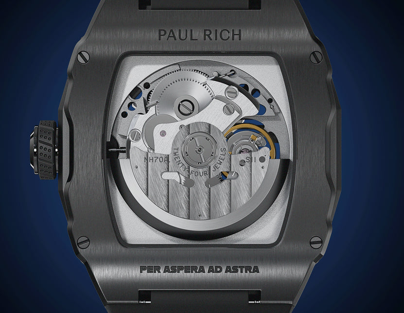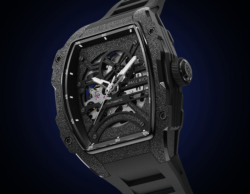Introducing the Paul Rich Astro Skeleton—a tonneau-shaped masterpiece that seamlessly integrates innovation with sophistication. Its transparent skeleton dial unveils the intricate mechanics beneath, showcasing frosted baseplates and bridges. You can also appreciate the movement within through the open case back.