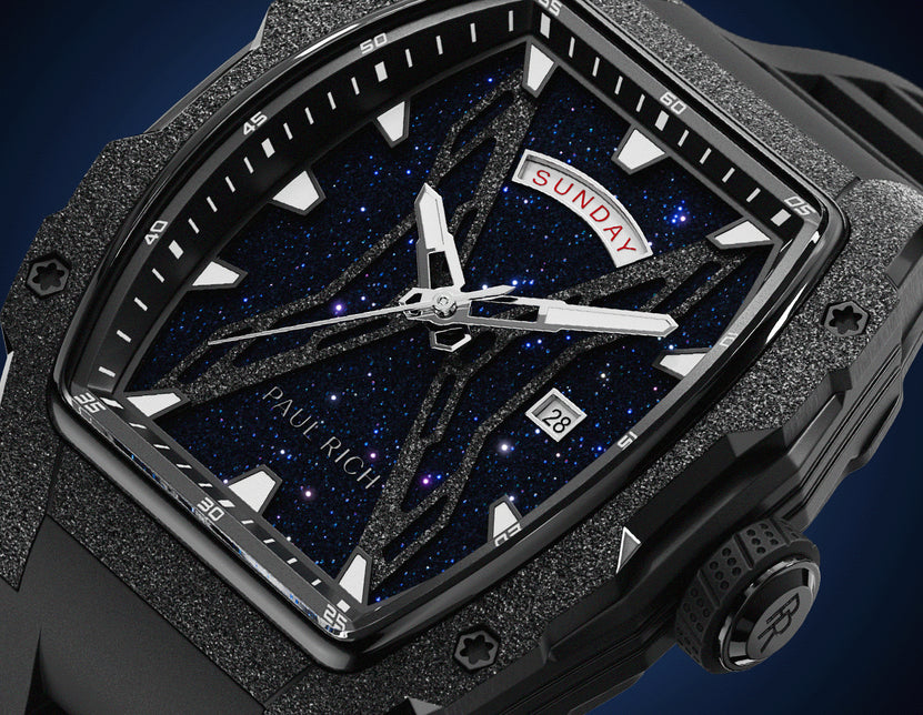 5 ATM water resistance, an anti-static silicone band, and a deployant clasp make this watch ready for anything. Style, function, and the universe—all on your wrist.