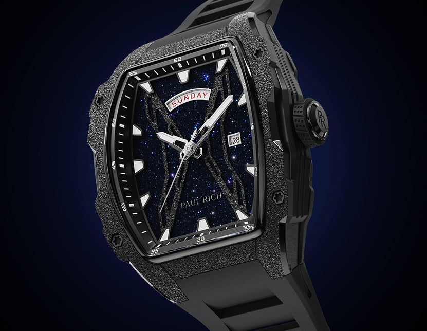 Sleek, frosted, and built for more. The Astro Day & Date tracks both the day of the week and the date, wrapped in a bold tonneau-shaped case. Modern design meets practicality.