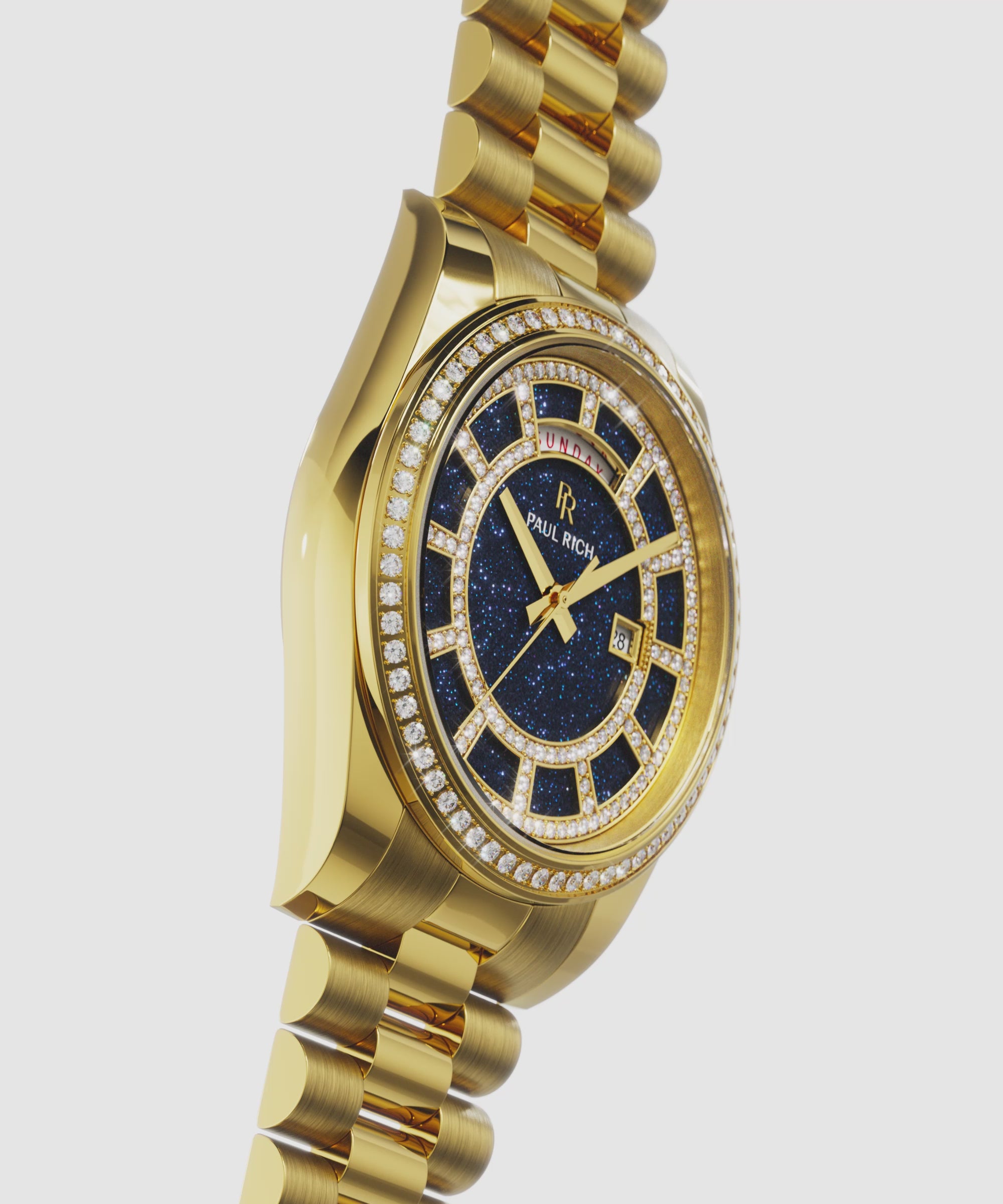 Meet Crown Legacy Gold – Aventurine Blue, made to stand out the moment it hits the light. The dial pairs deep blue aventurine stone with a full pavé of handset...