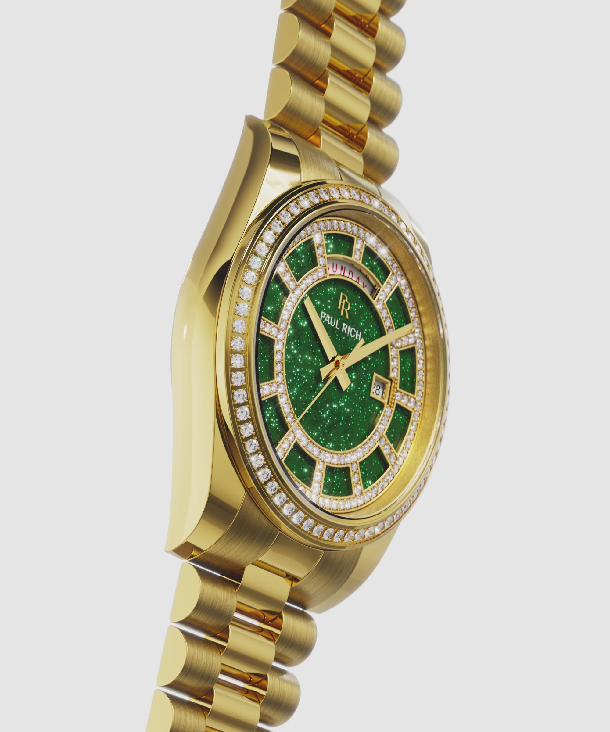 Meet Crown Legacy Gold – Aventurine Green, made to stand out the moment it hits the light. The dial pairs deep green aventurine stone with a full pavé of handset...