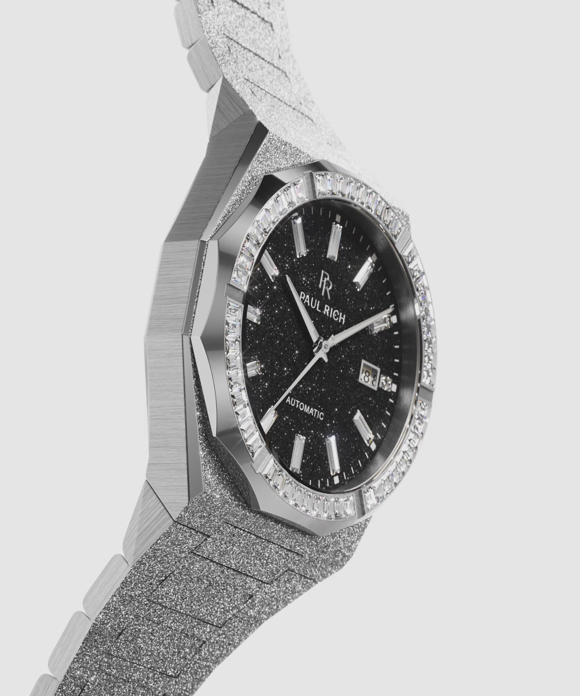 Meet the Moissanite Frosted Star Dust II – Black Aventurine. This is the brightest watch Paul Rich has ever built. Precisely 5.67 carats total weight of hand-cut moissanites cover the bezel and the dial in a continuous pavé field, creating a density of light normally reserved for full diamond settings. Every stone is placed to maximize contrast against the black aventurine beneath it, so the watch throws sharper flashes, cleaner reflections, and more depth than any of the other variants.