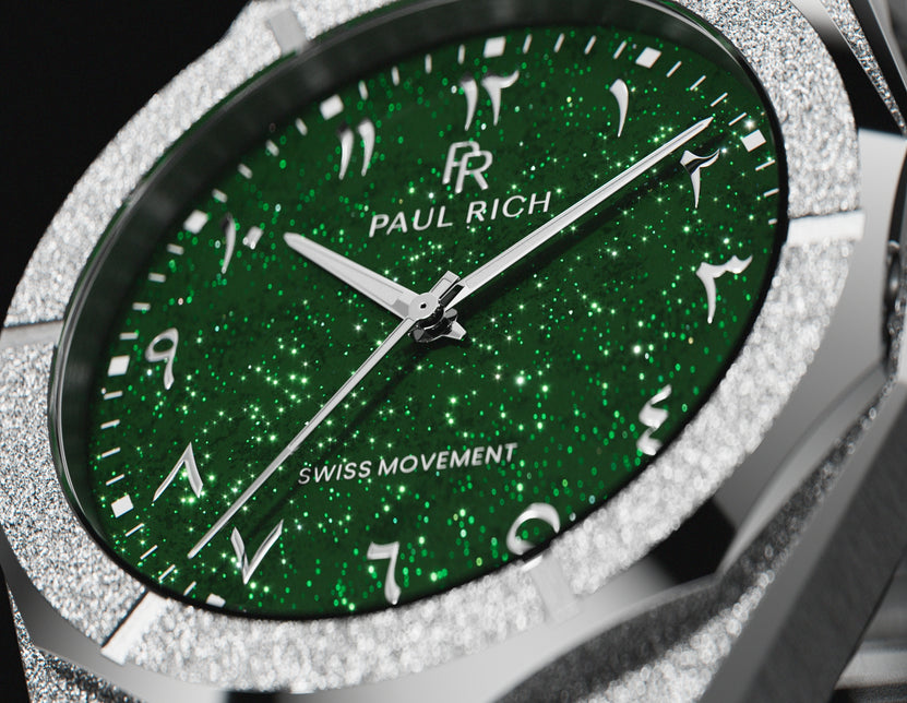 A fusion of cosmic elegance and Arabic heritage. This watch isn’t just about time—it’s about legacy. Arabic numerals on a galaxy dial, a nod to the Arabic world’s impact on math and astronomy. Wrapped in stainless steel with a frosted finish that hits like diamond dust. This isn’t just a watch; it’s culture on your wrist. Bold. Proud. Unmatched.