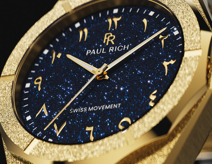 A fusion of cosmic elegance and Arabic heritage. This watch isn’t just about time—it’s about legacy. Arabic numerals on a galaxy dial, a nod to the Arabic world’s impact on math and astronomy. Wrapped in stainless steel with a frosted finish that hits like diamond dust. This isn’t just a watch; it’s culture on your wrist. Bold. Proud. Unmatched.