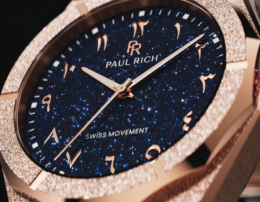 A fusion of cosmic elegance and Arabic heritage. This watch isn’t just about time—it’s about legacy. Arabic numerals on a galaxy dial, a nod to the Arabic world’s impact on math and astronomy. Wrapped in stainless steel with a frosted finish that hits like diamond dust. This isn’t just a watch; it’s culture on your wrist. Bold. Proud. Unmatched.