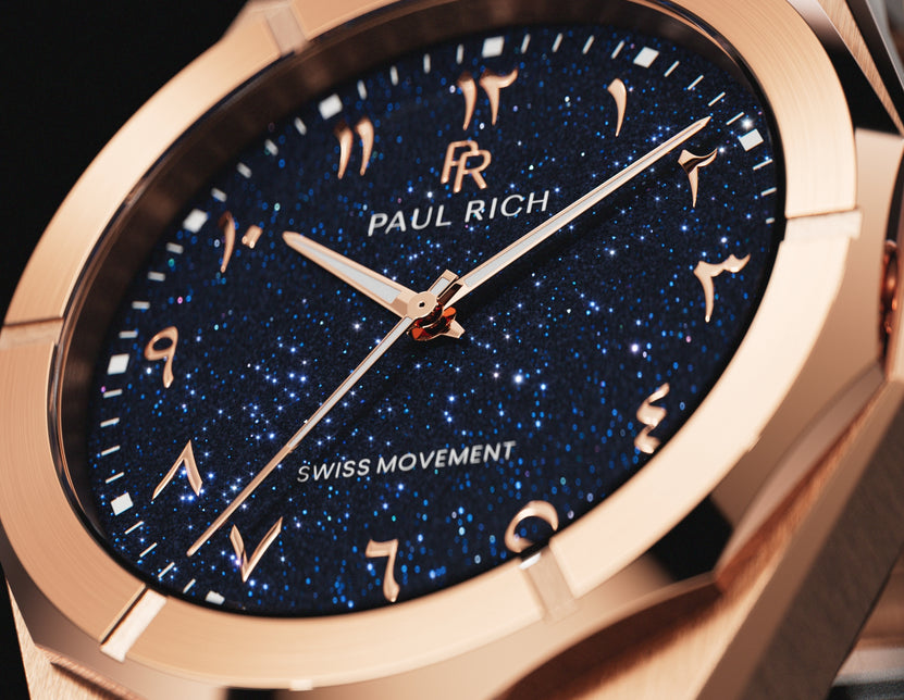 At Paul Rich, our signature aventurine dial is a hallmark of sophistication and exceptional craftsmanship. This unique dial is made from quartz embedded with tiny mineral inclusions, producing a mesmerizing, star-like effect. Originating from 17th-century Venetian glassmaking, the process involves embedding copper or hematite particles into molten quartz, resulting in a shimmering finish. Each dial is meticulously cold-cut and polished, reflecting our dedication to luxury and precision, making every Star Dust watch visually striking and truly unique.