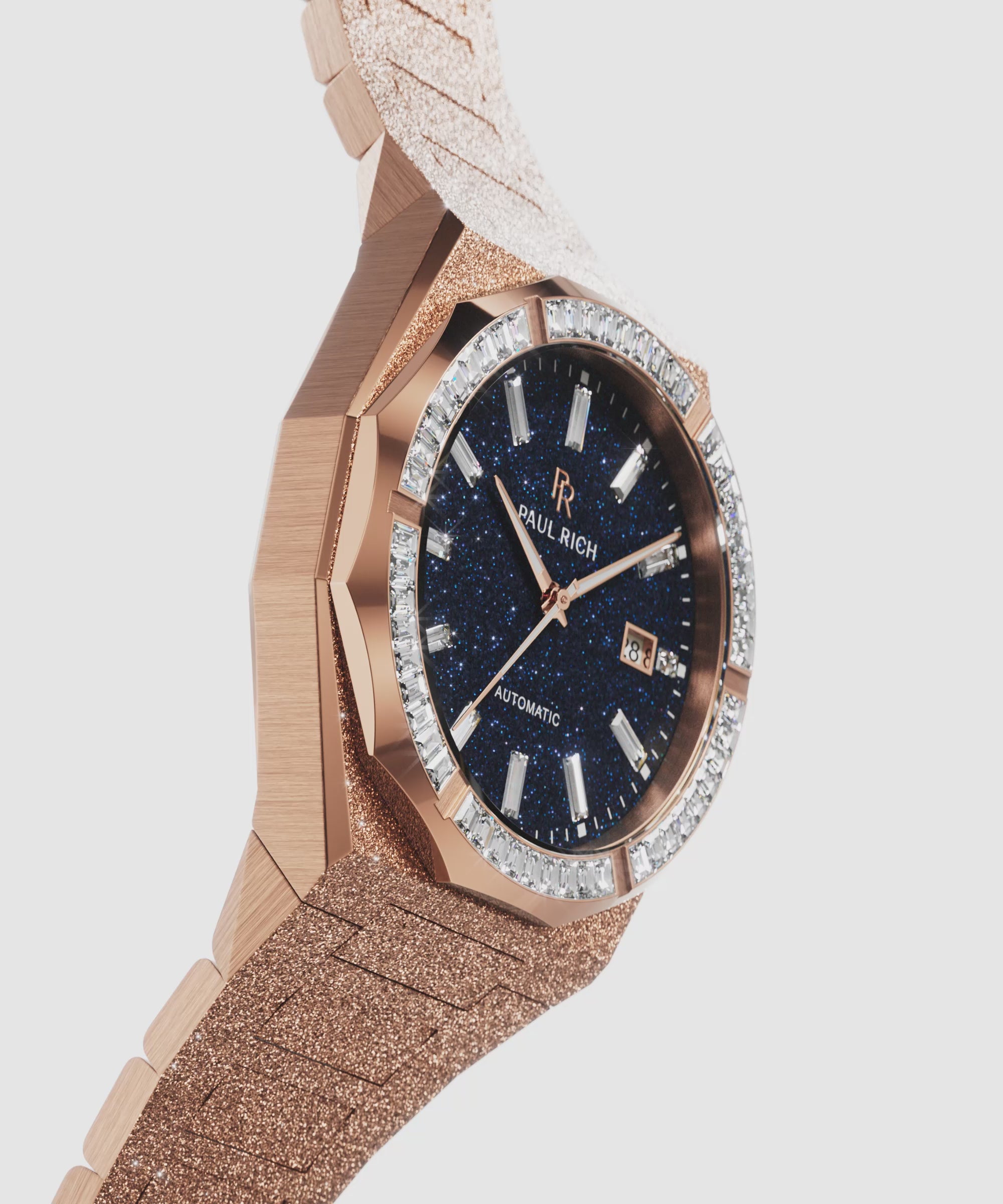 Beneath the surface, either a Swiss quartz or a fully automatic movement keeps perfect time β with the automatic revealed through a sapphire crystal case back. The 43 mm frosted case is sculpted with thousands of diamond-cut facets, each catching light like dust frozen mid-spark. The deep aventurine dial reflects a night sky alive with motion, balancing raw texture with refined detail.