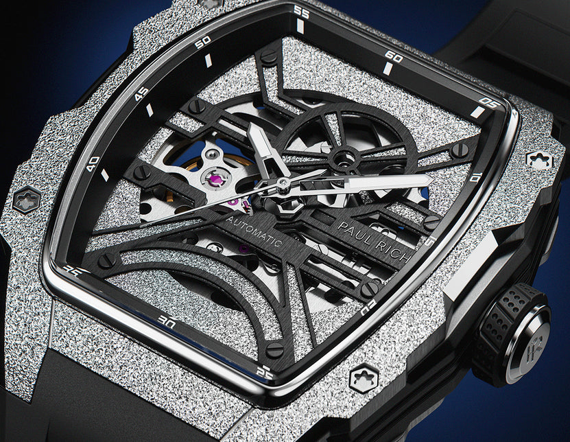 Introducing the Paul Rich Astro Skeleton—a tonneau-shaped masterpiece that seamlessly integrates innovation with sophistication. Its transparent skeleton dial unveils the intricate mechanics beneath, showcasing frosted baseplates and bridges. You can also appreciate the movement within through the open case back.