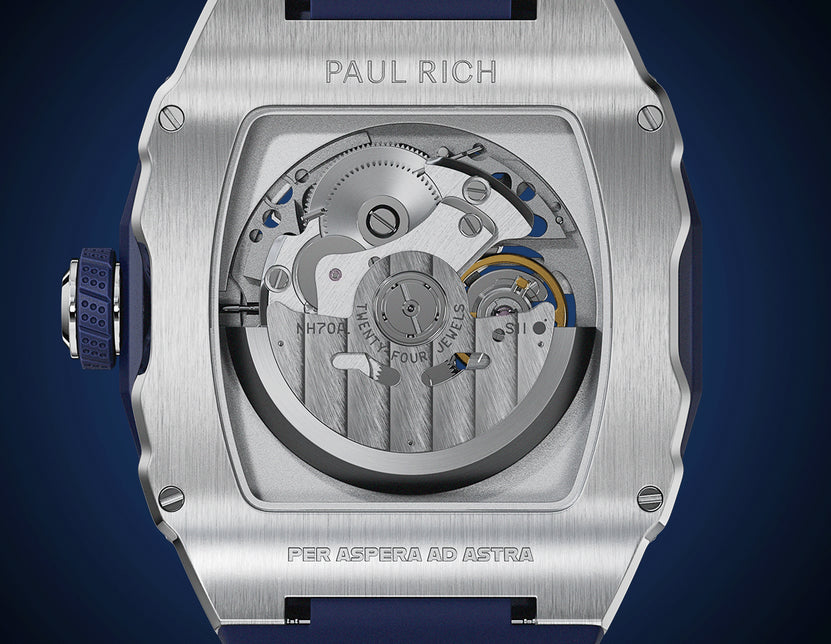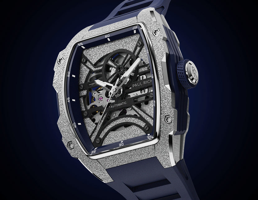 Introducing the Paul Rich Astro Skeleton—a tonneau-shaped masterpiece that seamlessly integrates innovation with sophistication. Its transparent skeleton dial unveils the intricate mechanics beneath, showcasing frosted baseplates and bridges. You can also appreciate the movement within through the open case back.