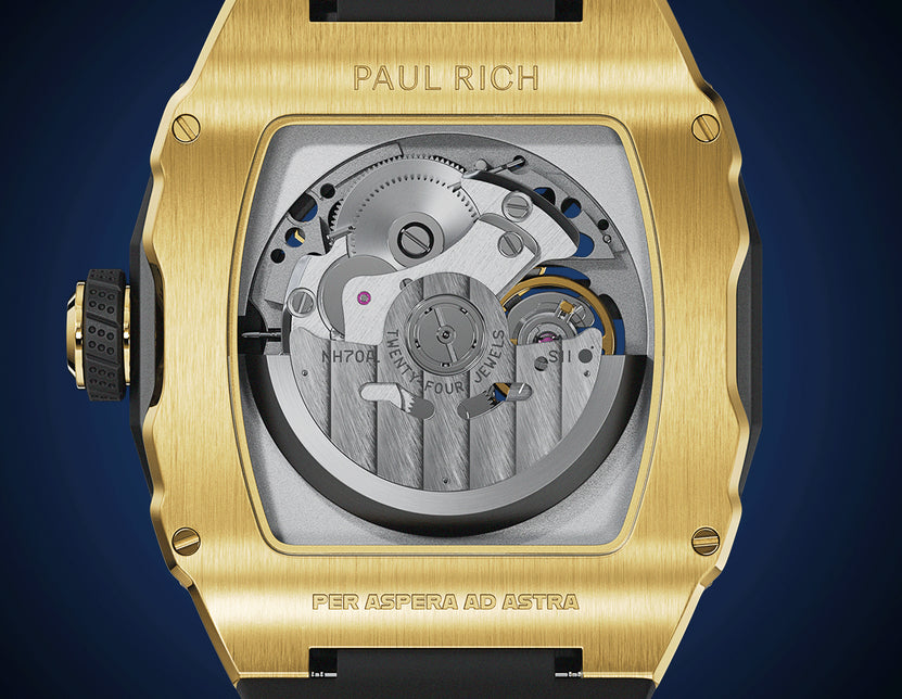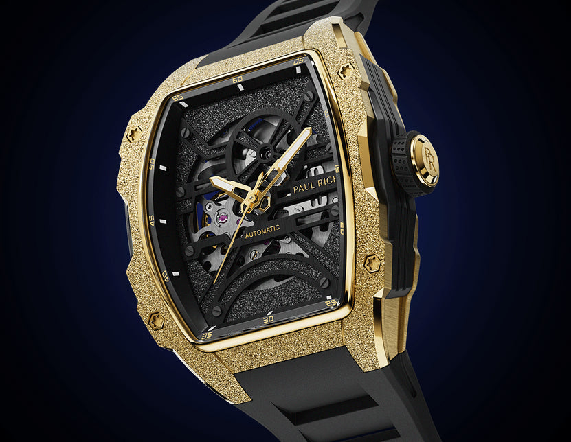 Introducing the Paul Rich Astro Skeleton—a tonneau-shaped masterpiece that seamlessly integrates innovation with sophistication. Its transparent skeleton dial unveils the intricate mechanics beneath, showcasing frosted baseplates and bridges. You can also appreciate the movement within through the open case back.