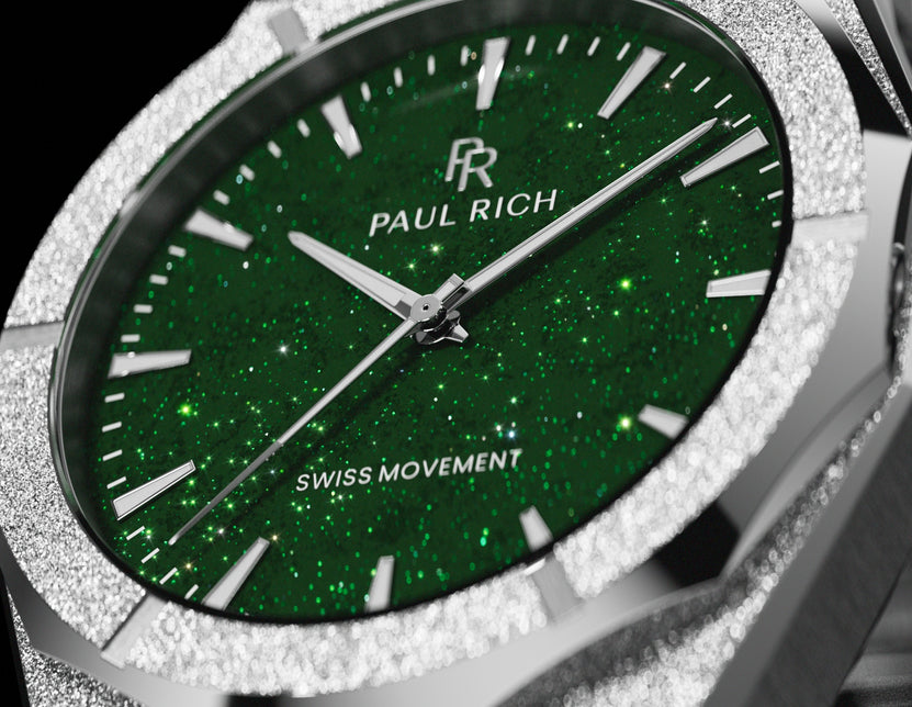 Bold. Rare. Unforgettable. A deep green aventurine dial that mirrors a midnight sky, wrapped in stainless steel with a frosted finish that shines like diamond dust. This isn’t just a watch—it’s art on your wrist. Elevated. Timeless. Unmatched.