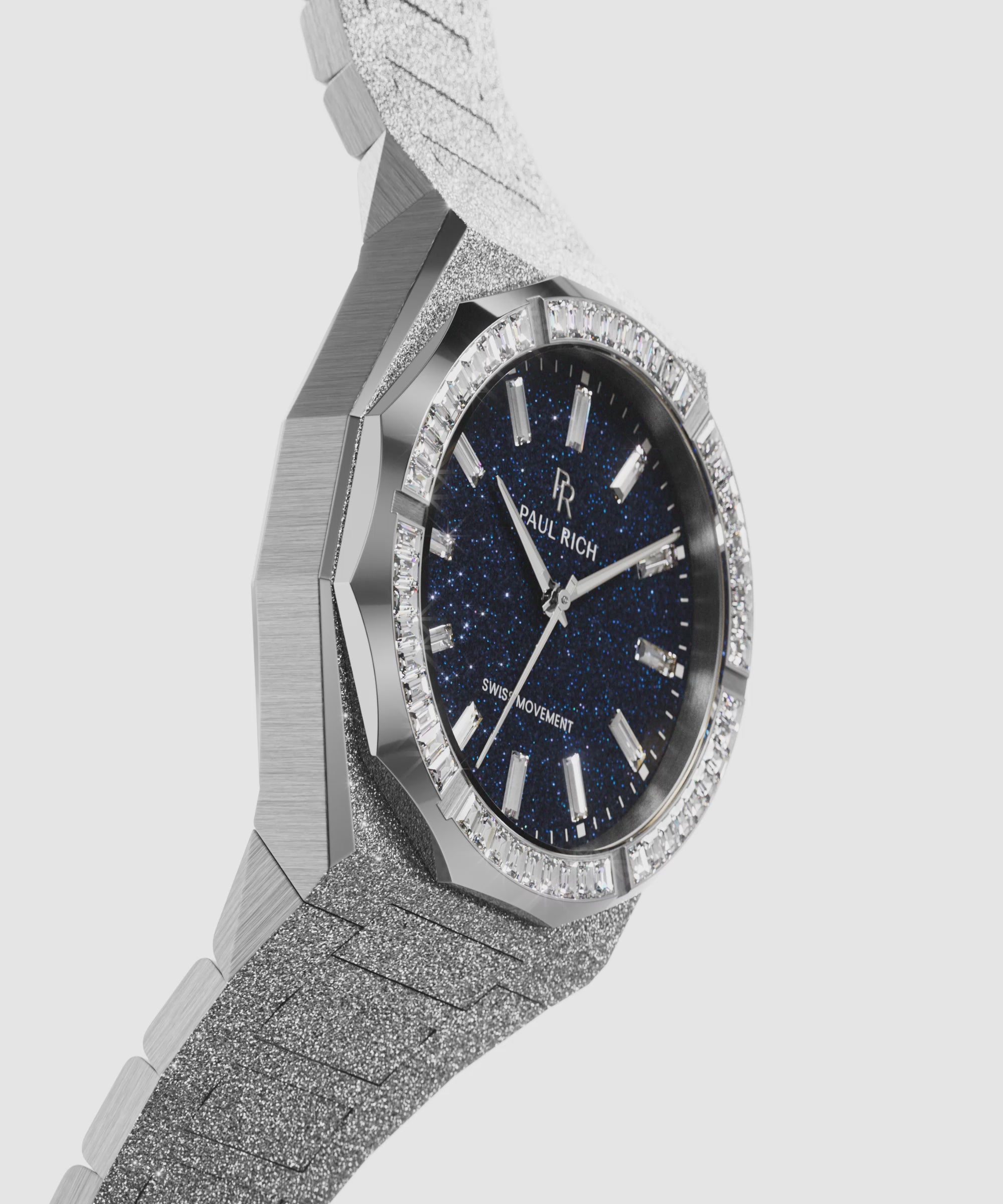 Beneath the surface, either a Swiss quartz or a fully automatic movement keeps perfect time β with the automatic revealed through a sapphire crystal case back. The 43 mm frosted case is sculpted with thousands of diamond-cut facets, each catching light like dust frozen mid-spark. The deep aventurine dial reflects a night sky alive with motion, balancing raw texture with refined detail.